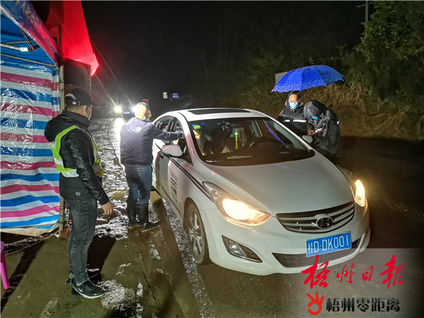 2月15日晚,夏郢鎮干部在答涓村值守點冒雨對過往車輛進行登記,檢測司乘人員體溫。歐文強 攝