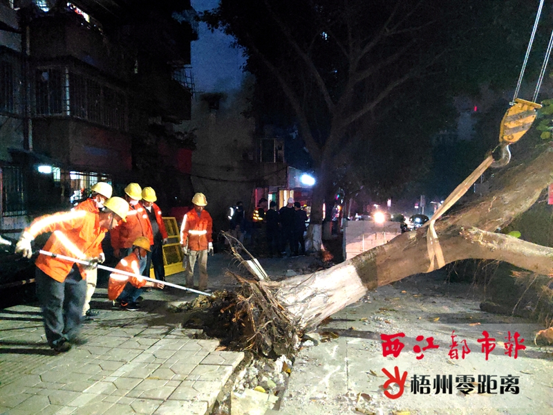 3月2日18時許,在西環(huán)路梧州市民政局對出路段,梧州市園林綠化工程處的工人對一棵倒伏的高山榕樹進(jìn)行清理。
