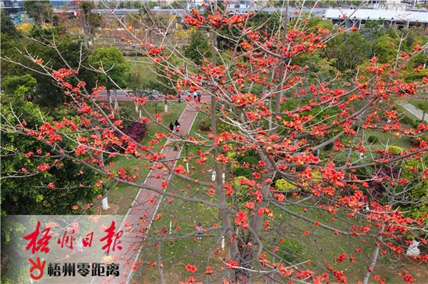 3月7日,玫瑰湖公園內,一株木棉樹開出滿樹橙色的花朵,異常醒目。記者 何鎏 攝