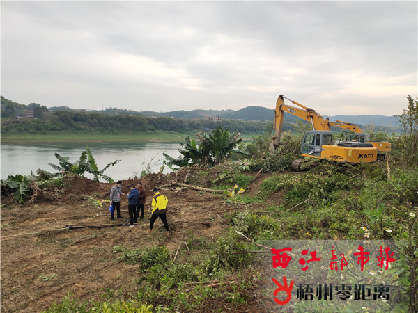 梧州零距離網-西江都市報訊(記者 蒙敏瑩 通訊員 黎瀅)為推進平浪防洪堤工程建設的有序開展,3月11日,長洲區相關部門對平浪防洪堤平浪村上平標段的荒木野草、農作物等地上附屬物進行清理。 3月11日上午,在平浪防洪堤平浪村上平標段,興龍街道辦及平浪村村委的工作人員對村民種植農作物的區域進行丈量清算,項目施工人員則利用挖掘機對岸坡上的竹林、野草、磚石等雜物進行清除。
