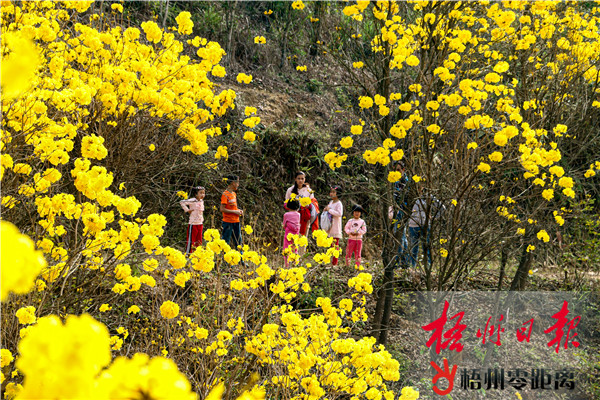 近日,藤縣和平鎮(zhèn)都坡村留村組山野的黃花風(fēng)鈴木的花朵盛開,吸引村民前去觀賞。鄧炎森 攝