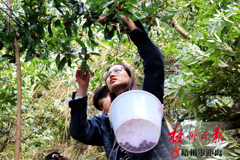 4月12日,游客在岑溪市馬路鎮伏六村一楊梅基地采摘早熟楊梅。