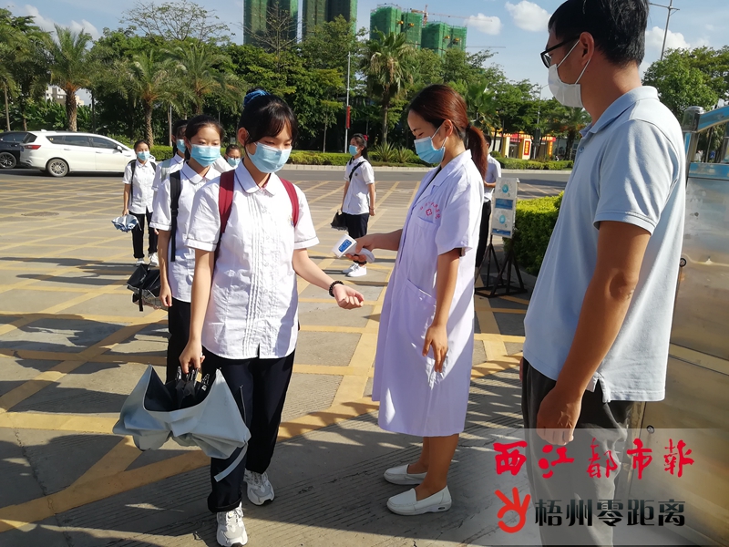 6月28日下午,梧州高級中學舉行高考及疫情防控應急演練,師生和校醫在校門進行體溫檢測。