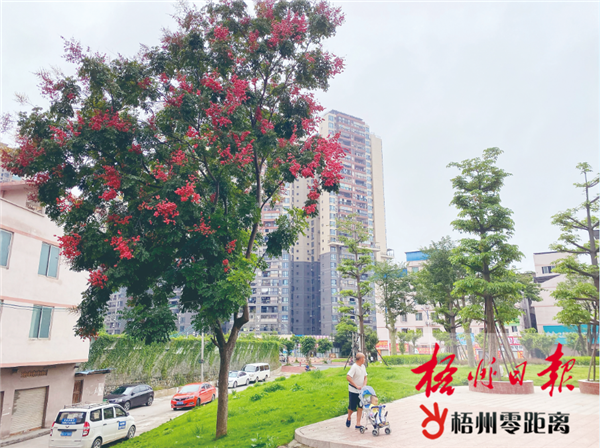 8月21日,迎賓路和新湖一路交界的街角小公園,一棵欒樹開出了艷麗的花朵。該片區經過道路提升工程后煥然一新,成為城市里一道靚麗的風景線。梧州日報記者 楊揚 攝