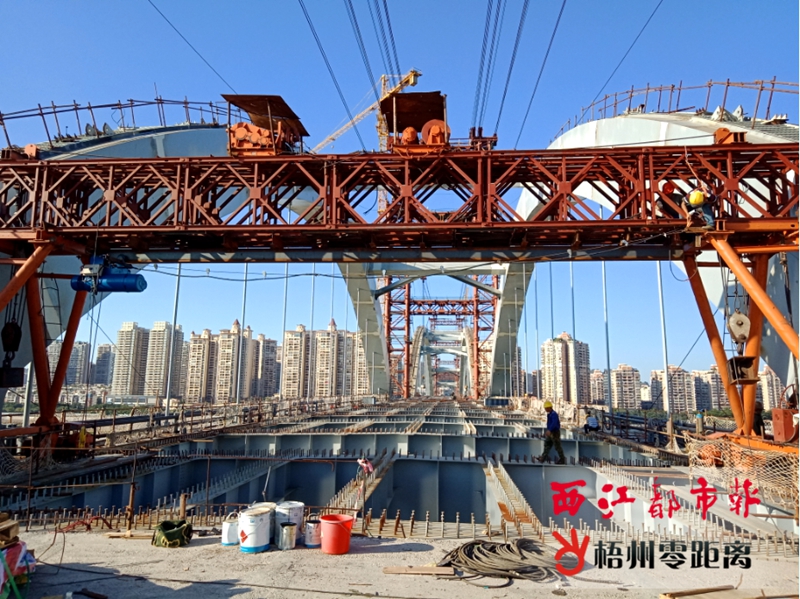 目前,西江四橋正在加快南岸邊拱橋面鋼縱梁安裝和主跨橋面鋼結構的吊裝。