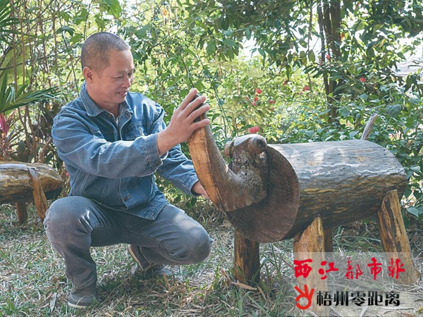 在富萬鄉村旅游區,黎祝安的作品受到游客的喜愛。 今年54歲的黎祝安從事木工制作已三十多年。2010年,他回到富萬村開了一家家具小作坊,如今他已成為附近家喻戶曉的家具木工師傅。 近年來,富萬村大力發展鄉村旅游產業,鄉村環境和旅游設施不斷提質升級。為了進一步豐富鄉村旅游元素,2018年,倒水鎮及富萬村的鎮村干部找到黎祝安,希望能利用他的手藝特長,制作一些木質動物制品裝點景區。