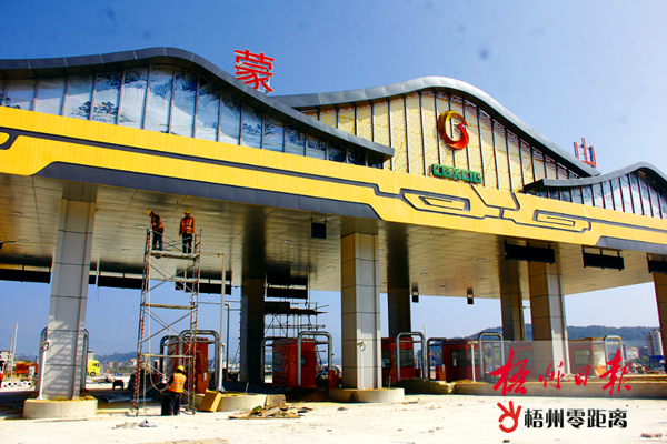 近日,在荔浦至玉林高速公路蒙山出入口,工人抓緊開展裝修和設備安裝調試工作。