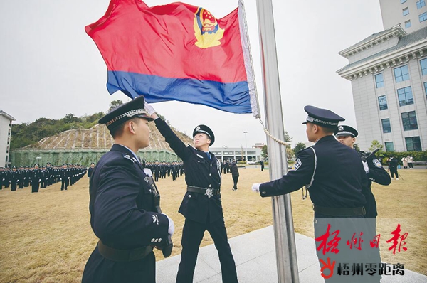 梧州零距離網-梧州日報訊(記者 陳雨燕 通訊員 曾亮 李蔚怡)1月10日,為慶祝首個“中國人民警察節”,梧州市公安局舉行了升警旗儀式。儀式上,市公安局、市中級人民法院、市人民檢察院、梧州邊防檢查站、梧州海關緝私分局、梧州監獄、各城區分局的民警、輔警代表,奏唱警歌、集體宣誓,牢記初心使命、堅定從警信念。