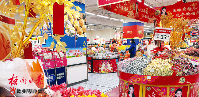 隨著辛丑年新春臨近,市區(qū)多家超市陸續(xù)開設(shè)年貨銷售專區(qū),吉祥喜慶的年節(jié)氣氛漸濃。 記者 梁燕如 攝