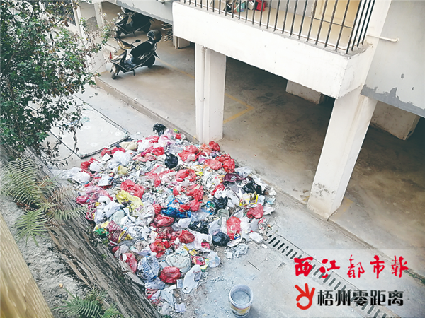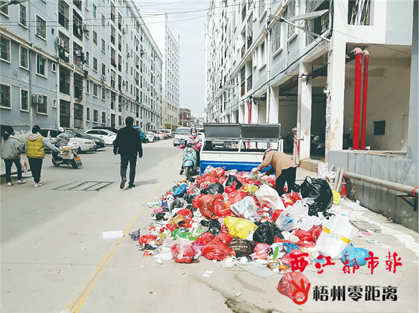 梧州零距離網-西江都市報訊(記者 黃燁玲)在龍圩區新塘沖廉租房小區內,一眼望去,樓房林立,在小區門口處,老人小孩坐在一起聊天曬太陽,儼然一幅和諧的冬日生活場景圖。然而,近段時間,有市民反映,新塘沖廉租房小區內垃圾清理不及時的情況多次發生,垃圾斗車都裝滿了垃圾,卻遲遲未見環衛工人運走,臭氣熏天,嚴重影響居民的生活環境。