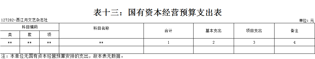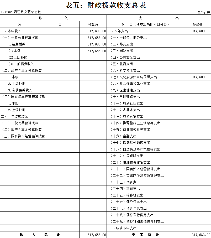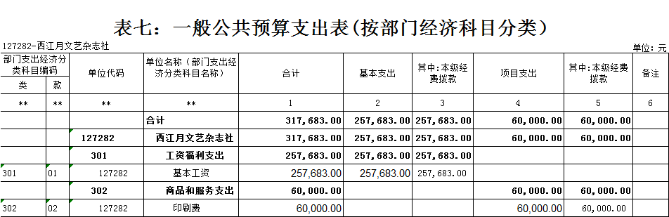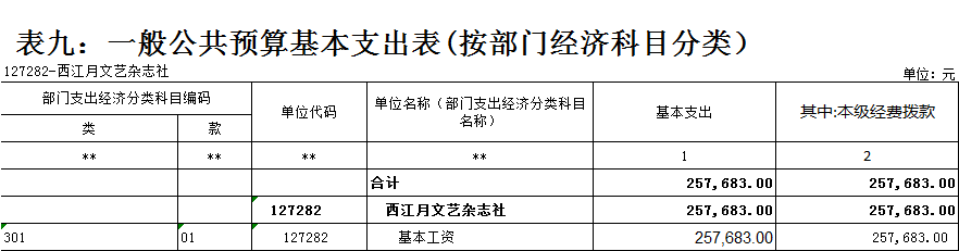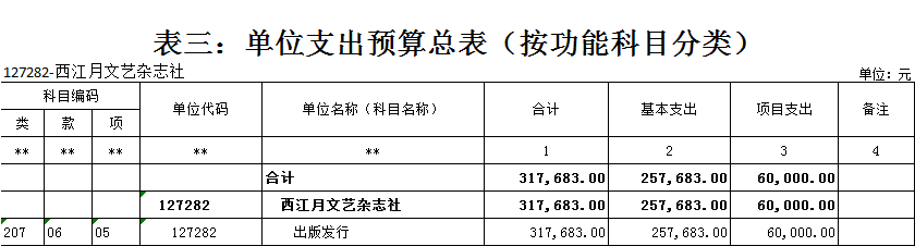西江月文藝雜志社2021年 單位預算及“三公”經費預算情況說明 目錄 第一部分:西江月文藝雜志社概況 一、主要職能 二、機構設置情況 三、人員構成情況 第二部分:西江月文藝雜志社單位預算及“三公”經費預算情況說明 一、單位收支預算總體預算情況說明 二、單位收入總體預算情況說明 三、單位支出總體預算情況說明 四、財政撥款收支預算情況說明 五、一般公共預算支出情況說明 六、一般公共預算基本支出情況說明 七、一般公共預算安排的“三公”經費情況說明 八、政府性基金預算情況說明 九、2021年單位預算其他事項說明 第三部分:專業名詞解釋 第四部分:西江月文藝雜志社2021年單位預算報表(詳見附件) 一、單位收支預算總表 二、單位收入預算總表 三、單位支出預算總表(按功能科目分類) 四、單位支出預算總表(按部門經濟科目分類) 五、財政撥款收支總表 六、一般公共預算支出表(按功能科目分類) 七、一般公共預算支出表(按部門經濟科目分類) 八、一般公共預算支出表(按政府經濟科目分類) 九、一般公共預算基本支出表(按部門經濟科目分類) 十、一般公共預算基本支出表(按項目類別) 十一、政府性基金預算支出表 十二、“三公”經費支出表 十三、國有資本經營預算支出表 第一部分:單位概況 一、主要職能 出版文藝雜志,促進文藝發展。《西江月》雜志出版發行。 二、機構設置情況 西江月文藝雜志社屬于差額事業單位,內設一個職能科室,編輯部。 三、人員構成情況 西江月文藝雜志社人員編制總數10名,其中:差額事業編制10名。其中,在職在編人員3人,包括:行政在職在編人員2人,后勤人員1人。離退休人員6人。 第二部分:西江月文藝雜志社2021年單位預算及“三公”經費預算情況說明 一、單位收支預算總體預算情況說明 2021年收支總預算317683元,同比無增長變化。收入包括:一般公共預算撥款;支出包括:文化旅游體育與傳媒支出。 2021年收支預算總體無增減。 二、單位收入總體預算情況說明 2021年收入總預算317683元,同比增加0元,增長0%。其中: (一)一般公共預算撥款(含上級補助,下同)317683元,占收入總預算的100%,同比無變化。 (二)本單位無政府性基金預算收入,同比無變化。 (三)本單位無財政專戶管理資金資金收入,同比無變化。 (四)本單位無事業收入,同比無變化。 (五)本單位無事業單位經營收入,同比無變化。 三、單位支出總體預算情況說明 2021年支出總預算317683元,其中,基本支出預算257683元,占支出總預算的81.12%,同比無變化;項目支出預算60000元,占支出總預算的18.88%,同比無變化。其中: (一)文化旅游體育與傳媒支出類科目317683元,占支出總預算100%,同比無變化。 四、財政撥款收支預算情況說明 2021年財政撥款收支總預算317683元。收入包括:一般公共預算撥款317683元;支出包括:文化旅游體育與傳媒支出317683元。 五、一般公共預算支出情況說明 2021年一般公共預算撥款支出317683元,其中:基本支出257683元,項目支出60000元,具體支出預算如下: (一)一般公共預算支出按支出功能分類科目劃分。 出版發行317683元,其中:基本支出257683元,項目支出60000元。主要用于出版文藝雜志,促進文藝發展。《西江月》雜志出版發行。 (二)按支出結構分類劃分,分為基本支出預算和項目支出預算。 1.基本支出預算257683元,占支出總預算的81.12%,同比無變化。其中: 工資福利支出預算257683元,占基本支出預算100%,同比無變化。 2.項目支出60000元,占支出總預算的18.88%,同比無變化。其中: 商品和服務支出預算60000元,占項目支出預算100%,同比無變化。 六、一般公共預算基本支出情況說明 2021年一般公共預算基本支出257683元,其中: 人員經費257683元,主要包括:基本工資。 公用經費0元。 七、一般公共預算安排的“三公”經費情況說明 (一)2021年部門預算全口徑安排的“三公”經費預算情況。 2021年部門預算全口徑安排“三公”經費支出預算0元,同比無變化。 其中: 1.因公出國(境)經費支出預算0元,同比無變化。 2.公務接待費支出預算0元,同比無變化。 3.公務用車費預算0元,同比無變化。 其中: (1)公務用車運行維護費支出預算0元,同比無變化。 (2)公務用車購置費0元,同比無變化。 (二)2021年一般公共預算資金安排的“三公”經費預算情況。 2021年一般公共預算安排的“三公”經費支出預算0元,同比無變化。其中:本級經費撥款預算0元,同比無變化。具體是: 1.因公出國(境)經費支出預算0元,根據財政局統一要求,各單位一般公共預算安排的因公出國(境)費不編入部門預算,執行中根據外事管理部門批準的年度出國計劃申請調整支出。 2.公務接待費預算0元,同比無變化。其中:本級經費撥款預算0元,同比無變化。 3.公務用車費預算0元,同比無變化。其中:本級經費撥款預算0元,同比無變化。 具體是: (1)公務用車運行維護費預算0元,同比無變化。其中:本級經費撥款預算0元,同比無變化。 (2)公務用車購置預算0元,同比無變化。其中:本級經費撥款預算0元,同比無變化。 八、政府性基金預算情況說明 2021年本單位無政府性基金收支業務,因此沒有相應的政府性基金收支預算。 九、2021年單位預算其他事項說明 (一)機關運行經費預算安排情況。 單位機關行政運行經費財政撥款預算0元,單位出版發行安排317683元,同比無變化。其中:基本支出257683元;項目支出60000元。包