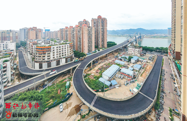 6月21日,西江四橋北岸引橋匝道鋪上了瀝青路面。