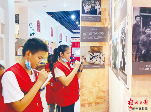 小記者們記錄梧州發展的故事。覃競儀 攝 在中共梧州地委·廣西特委舊址陳列館中,兩張沒有照片顯示的市委書記資料圖片,引起了小記者們的注意。“這是郭金水和陳啟東,因為當時拍照費用高昂,也為了隱藏黨員身份,以防被敵方識破,革命烈士們至死都沒有擁有一張屬于自己的照片。”講解員介紹道。小記者們頓時紅了眼眶,駐足許久。“革命烈士在艱苦的環境下頑強抗爭,革命精神深深感染著我們。”小記者林楚軒深情地說。