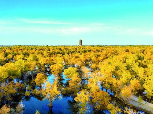 轉過幾道樹影,一灣碧水赫然出現在眼前。初冬的金波湖,如同大漠中起舞的女子,一襲華美的錦袍,煙波蕩漾,身姿曼妙。最令人驚奇的,是碧波中那棵高大的胡楊,她仿佛一位高傲的領舞者,孑然立在水中央,樹冠上的金色葉子密密層層,像是王冠上的寶石一般奪目。寒風過處,周圍大大小小數不清的胡楊圍繞著金波湖翩翩起舞,她們既是初冬的舞者,又是沙漠的衛士,歲歲年年守護著這顆干涸之地的明珠。