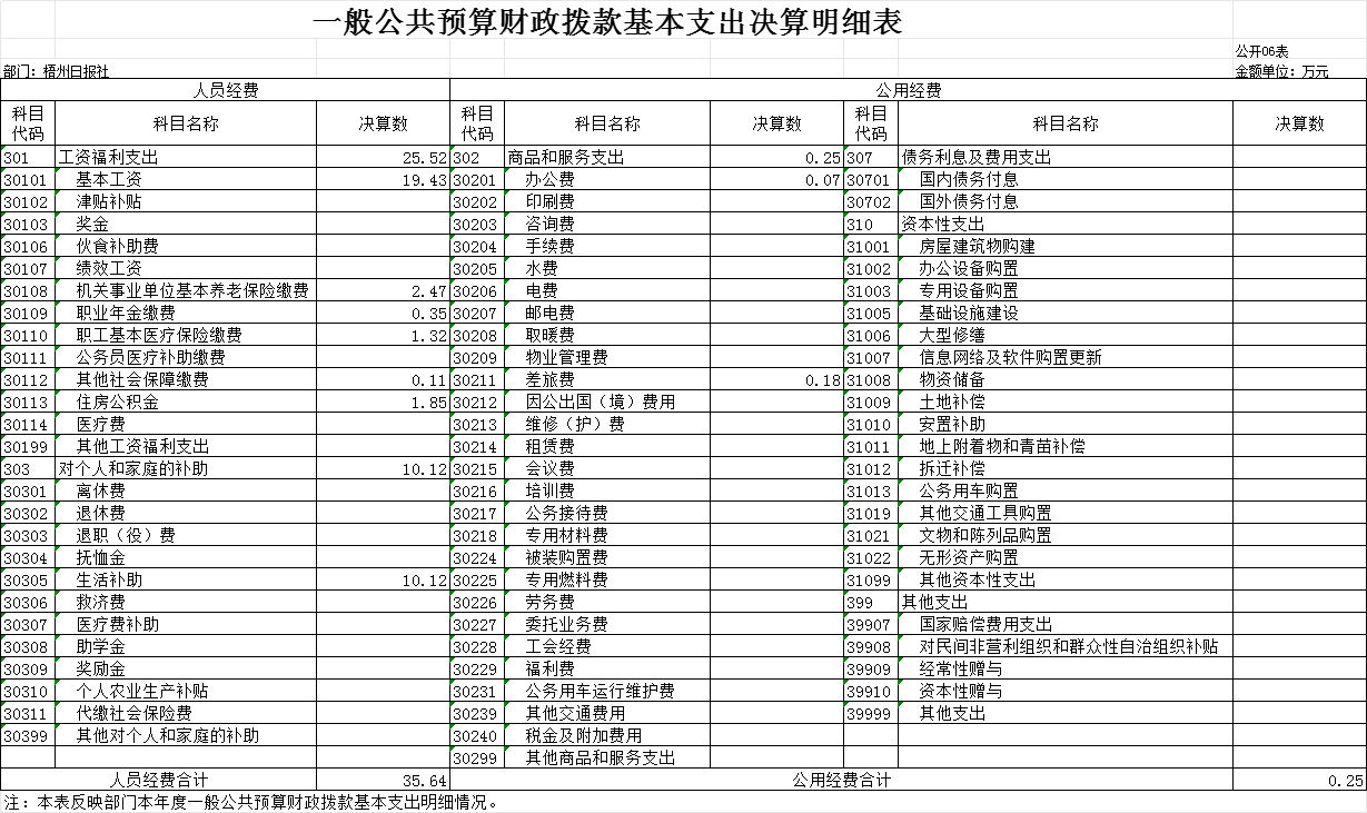 梧州日?qǐng)?bào)社2023年度一般公共預(yù)算財(cái)政撥款基本支出35.89萬元,其中:人員經(jīng)費(fèi)支出35.64萬元,主要包括:基本工資19.43萬元,機(jī)關(guān)事業(yè)單位基本養(yǎng)老保險(xiǎn)繳費(fèi)2.47萬元,職業(yè)年金繳費(fèi)0.35萬元,職工基本醫(yī)療保險(xiǎn)繳費(fèi)1.32萬元,其他社會(huì)保障繳費(fèi)0.11萬元,住房公積金1.85萬元,生活補(bǔ)助10.12萬元,公用經(jīng)費(fèi)支出0.25萬元,辦公費(fèi)0.07萬元,差旅費(fèi)0.18萬元,支出具體情況如下: