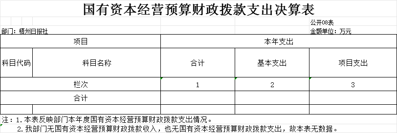 梧州日?qǐng)?bào)社2023年度國(guó)有資本經(jīng)營(yíng)預(yù)算支出年初預(yù)算為0.00萬元,支出決算為0.00萬元,完成年初預(yù)算的0%。