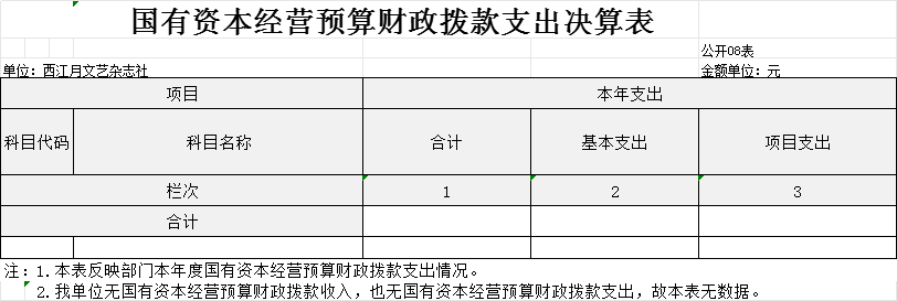 西江月文藝雜志社2023年度國有資本經營預算支出0.00萬元,其中:基本支出0.00萬元,項目支出0.00萬元。