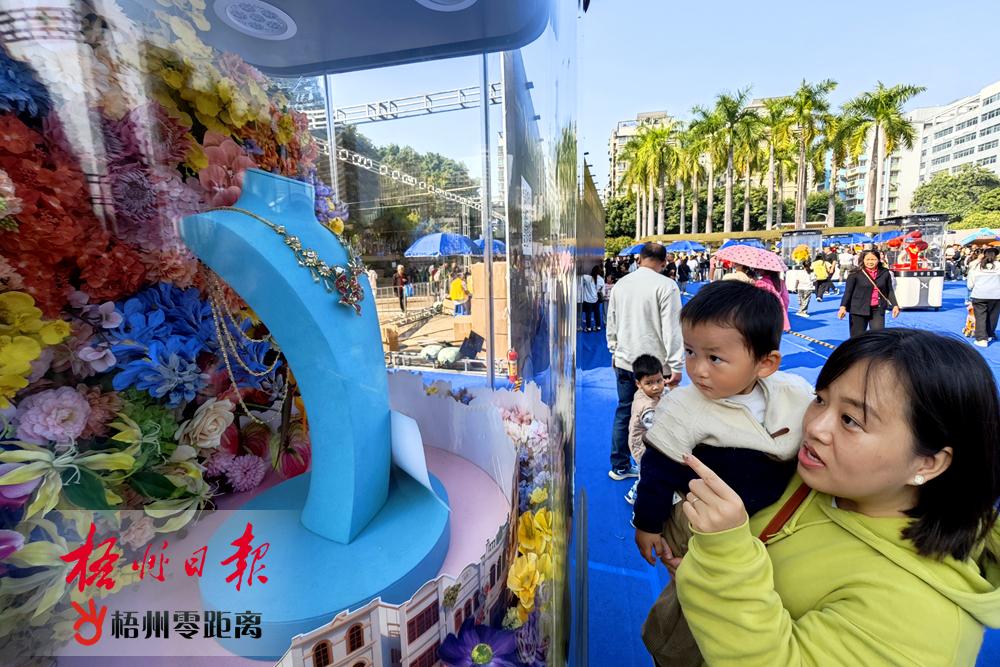 梧州零距離-梧州日報訊(記者 王維紅 霍林)第二十二屆梧州寶石節開幕次日恰逢周六休息日,在市政廣場舉辦的珠寶首飾暨名特優產品展銷會熱度不減,現場人頭攢動。海內外客商齊聚搶抓商機,市民游客爭相打卡,在琳瑯滿目的展品中感受梧州寶石盛宴的獨特魅力。