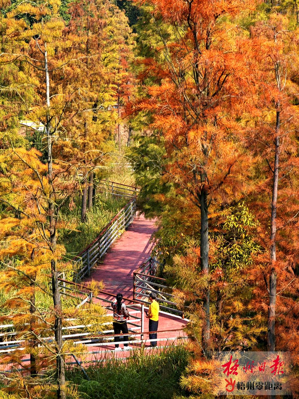 近日,在蒼海湖東岸,游客在水杉樹下游玩。近段時間,蒼海公園周邊的水杉樹葉逐漸由綠轉紅,吸引不少游客前來觀賞。記者 何鎏 攝