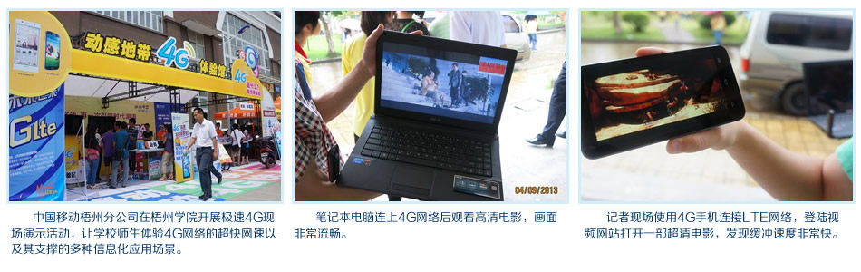 在梧州職業學院,記者現場使用4G手機連接LTE網絡,登陸視頻網站打開一部超清電影,發現緩沖速度非常快。而且,即使在未緩沖完全的情況下,拉動播放進度條至任何時段,畫面轉換也不存在卡頓或跳播的情況。現場下載一部高清電影,體驗峰值約80M每秒的超級移動寬帶下載速度,比3G快10倍以上的網速,一部4G的高清大片下載僅需幾分鐘左右。